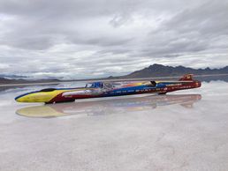 TURBINATOR II, with driver Dave Spangler, set the all time FASTEST mile speed, 463.038 mph FASTEST quarter speed, 369.143 mph, and FASTEST exit speed 470.605 mph in Speed Week's 70 year history on the Bonneville Salt Flats (2018).